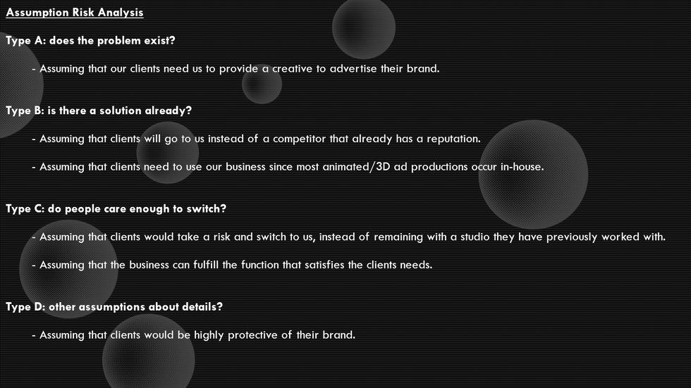 "Identifying risks for my business idea is a procedure that I've undertaken previously (~two weeks ago). Seeing a layout like this tempts me to redo a risk assessment using the methods covered today. Especially since my idea remains in limbo (feasibility of the business was questionable). Something that might be worth doing, is allowing a peer to add to my risk assessment after pitching to them. Having a second input to poke holes in the business idea would reveal more risks/assumptions. I think this would be even more effective when including the principals of the primary and secondary research covered today."